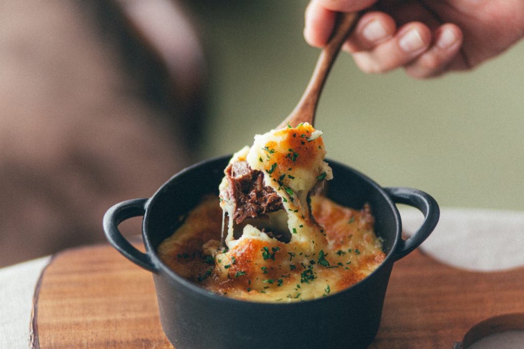 その贅沢な煮込みの上に、なめらかでクリーミーなポテトのグラタンをたっぷりと重ねました。