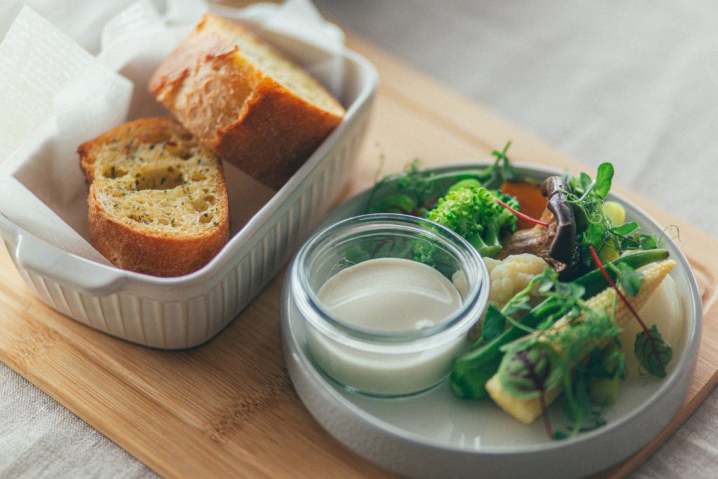 香ばしく焼き上げたガーリックトーストと彩り野菜のバーニャカウダ。