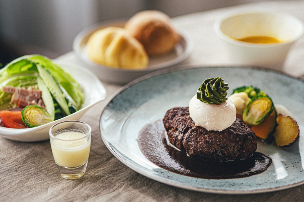 掛川牛を使ったハンバーグに、掛川茶を使ったバターを乗せた一品です。
