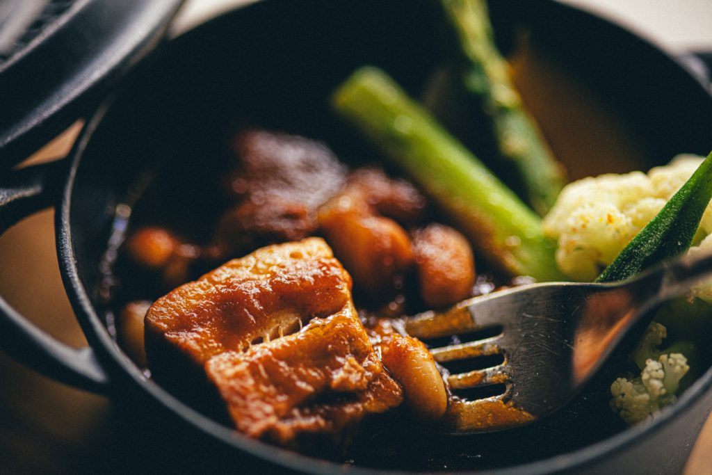 ココットの蓋を開けた瞬間に広がるのは、豊かな磯の香り。浅利(あさり)から出る濃厚な出汁と白身魚の旨味がスープに溶け込み、最後の一滴まで飲み干したくなる深い味わいに仕上げました。魚介のエキスを存分に堪能できる、贅沢な煮込み料理です。