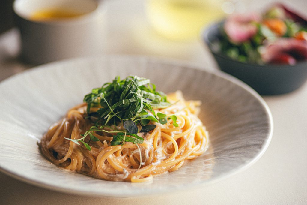 明太子のピリッとした辛みとクリームの甘みが調和したソースに、ふっくらとしたしらすをたっぷりと。添えられたハーブサラダが、後味を爽やかに演出します。