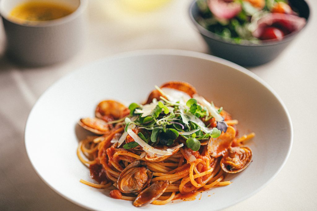 あさりの旨味が凝縮されたスープに、トマトの爽やかな酸味をプラス。海の香りが口いっぱいに広がる、王道のイタリアンパスタです。