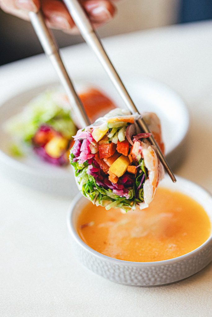 たっぷり野菜とエビを巻いた、さっぱりヘルシーな生春巻き。